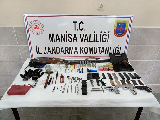 Manisa ili Ahmetli İlçesi Dereköy Matdere mahallesinde MANİSA İl J.K.lığı İsth.Şb.Md.lüğü, KOM Şb. Md.lüğü ve Ahmetli İlçe J.K.lığınca Müşterek Görev kapsamında yapılan istihbari çalışmalar neticesinde M.K.(Erkek-36 ) isimli şahsın, evinde uyuşturucu madde kullandığı ve ticaretini yaptığı istihbari bilgisi alınması üzerine, Adli makamlardan alınan arama kararına istinaden şüpheli  şahsın evinde ve eklentilerinde yapılan arama neticesinde, 5 gram uyuşturucu madde olduğu değerlendirilen kurutulmuş bitki ile uyuşturucu madde içiminde kullanılan 3 adet BONG diye tabir edilen aparat ve uyusturucu maddenin içiminde kullanılan çeşitli sayıda aparat ele geçirilmiş olup aramanın devamında evin avlu kısmında yapılan arama neticesinde 1 adet ruhsatsız çift kırma av tüfeği ve tüfeğe ait 13 adet kartuş, 1 adet el yapımı Beretta ibareli tabanca ile 43 adet 9 mm. çapında fişek,  29 adet 7.65 mm fişek, 7 adet tabanca şarjörü,  8 adet kabza, 2 adet tabanca komple gövdesi, 3 adet üst kapak takımı, 3 adet horoz ve emniyet tertibatı ile tabanca yapımında kullanılan çeşitli boy ve ebatta muhtelif 100 adet malzeme ve 1 adet tabanca yapımında kullanılan mengene tespit edilerek el konulmuştur. Olayla ilgili tahkikata başlanılmıştır.